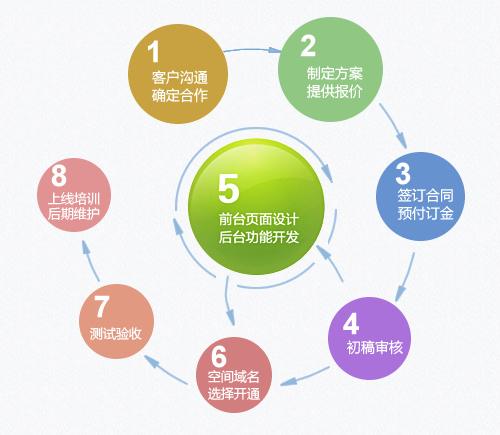 網站建設流程概述:客戶溝通,確定合作意向→制定建設方案,提供報價→簽訂合同,預付定金→初稿審核→前臺頁面設計,后臺程序開發→空間及域名選擇、開通→測試驗收→上線培訓,后期維護